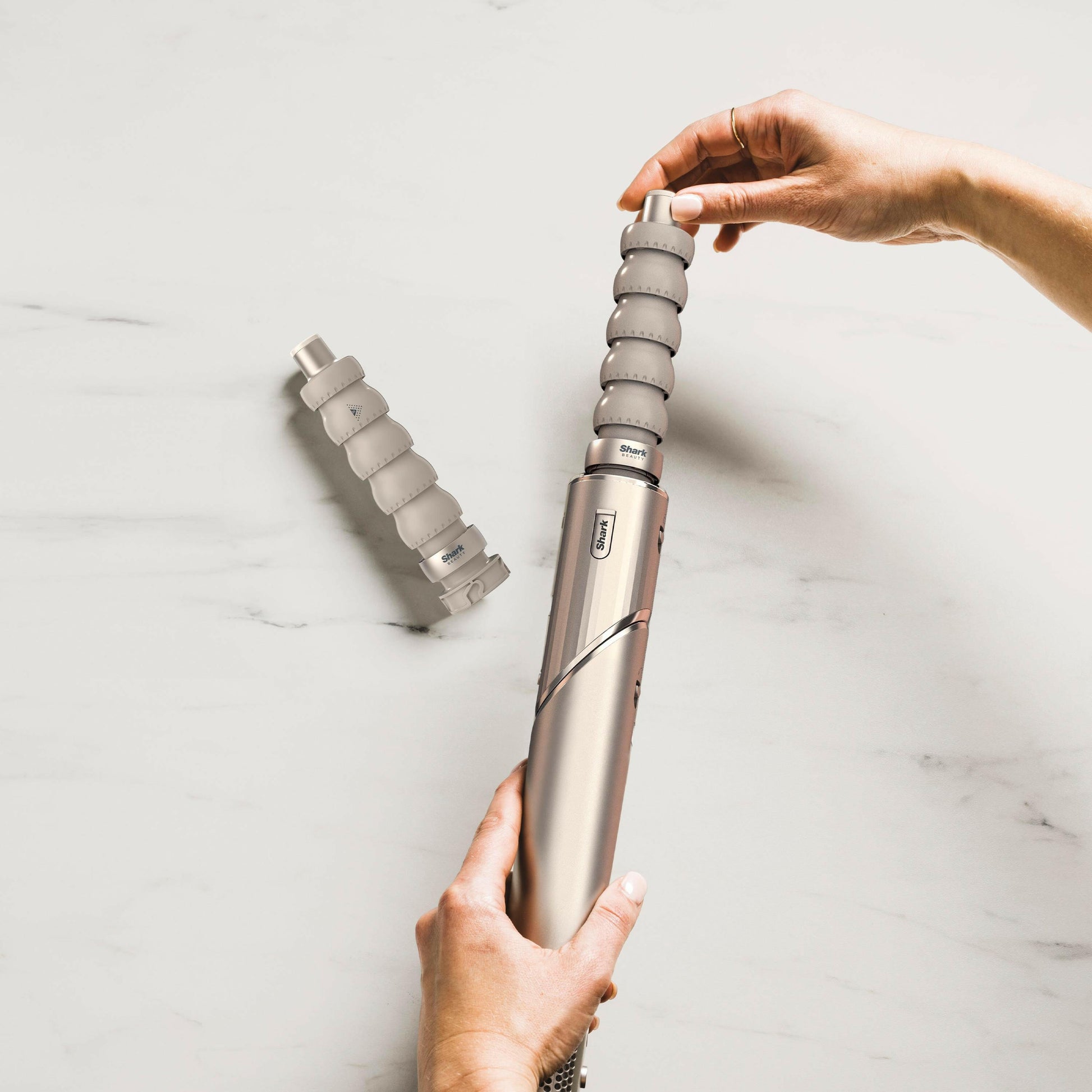 Vergessen Sie fliegendes Haar und Frizz! Im Vergleich zum Lufttrocknen sorgt der FlexStyle für geschmeidige, glänzende Ergebnisse und reduziert unerwünschtes Kräuseln um ein Vielfaches.