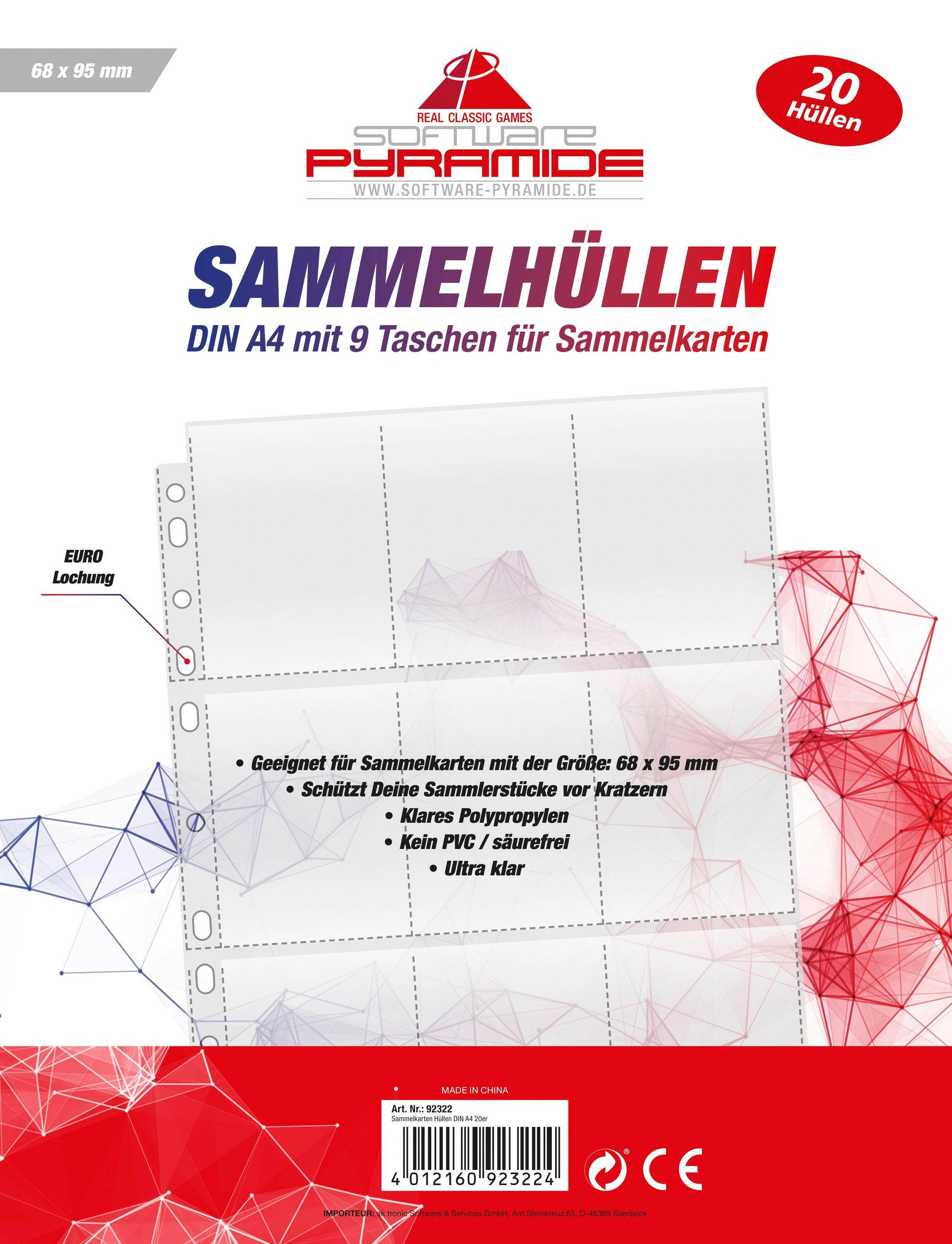 Diese hochwertigen Sammelkartenhüllen der Marke Software Pyramide sind die perfekte Ergänzung für jeden Sammler. Mit dem 20er-Pack Din A4 Hüllen mit je 9 Taschen kannst du deine wertvollen Sammelkarten sicher aufbewahren und vor Kratzern schützen. Die Hüllen sind mit einer EURO Lochung versehen und eignen sich ideal für Sammelkarten mit der Größe 68 x 95 mm.
